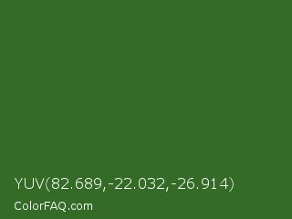 YUV 82.689,-22.032,-26.914 Color is a dark green color and the nearest color is Mughal Green #306030. Hex code #346b26 and RGB value is rgb(52,107,38). In RGB color space, this color is composed of 20% red, 42% green, 15% blue, In CMYK color space, this color is composed of 51% cyan, 0% magenta, 64% yellow , 58% black , In HSL color space, this color has a hue angle of 108° , 48% saturation and 28% lightness.