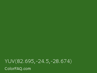 YUV 82.695,-24.5,-28.674 Color is a dark green color and the nearest color is Dell #396413. Hex code #326d21 and RGB value is rgb(50,109,33). In RGB color space, this color is composed of 20% red, 43% green, 13% blue, In CMYK color space, this color is composed of 54% cyan, 0% magenta, 70% yellow , 57% black , In HSL color space, this color has a hue angle of 107° , 54% saturation and 28% lightness.
