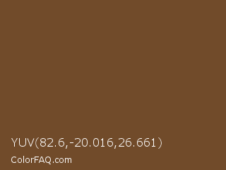 YUV 82.6,-20.016,26.661 Color is a dark orange color and the nearest color is Dallas #6e4b26. Hex code #714b2a and RGB value is rgb(113,75,42). In RGB color space, this color is composed of 44% red, 29% green, 16% blue, In CMYK color space, this color is composed of 0% cyan, 34% magenta, 63% yellow , 56% black , In HSL color space, this color has a hue angle of 28° , 46% saturation and 30% lightness.