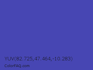 YUV 82.725,47.464,-10.283 Color is a normal indigo color and the nearest color is Ocean Blue #4f42b5. Hex code #4746b3 and RGB value is rgb(71,70,179). In RGB color space, this color is composed of 28% red, 27% green, 70% blue, In CMYK color space, this color is composed of 60% cyan, 61% magenta, 0% yellow , 30% black , In HSL color space, this color has a hue angle of 241° , 44% saturation and 49% lightness.