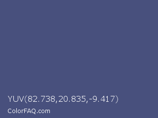 YUV 82.738,20.835,-9.417 Color is a normal blue color and the nearest color is Purple Navy #4e5180. Hex code #48507d and RGB value is rgb(72,80,125). In RGB color space, this color is composed of 28% red, 31% green, 49% blue, In CMYK color space, this color is composed of 42% cyan, 36% magenta, 0% yellow , 51% black , In HSL color space, this color has a hue angle of 231° , 27% saturation and 39% lightness.