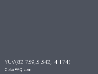YUV 82.759,5.542,-4.174 Color is a normal blue color and the nearest color is Trout #4a4e5a. Hex code #4e535e and RGB value is rgb(78,83,94). In RGB color space, this color is composed of 31% red, 33% green, 37% blue, In CMYK color space, this color is composed of 17% cyan, 12% magenta, 0% yellow , 63% black , In HSL color space, this color has a hue angle of 221° , 9% saturation and 34% lightness.