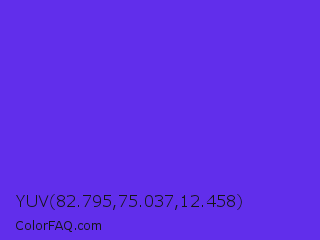 YUV 82.795,75.037,12.458 Color is a normal indigo color and the nearest color is Han Purple #5218fa. Hex code #612eeb and RGB value is rgb(97,46,235). In RGB color space, this color is composed of 38% red, 18% green, 92% blue, In CMYK color space, this color is composed of 59% cyan, 80% magenta, 0% yellow , 8% black , In HSL color space, this color has a hue angle of 256° , 83% saturation and 55% lightness.