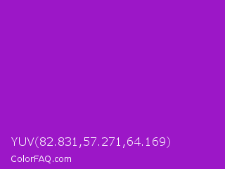 YUV 82.831,57.271,64.169 Color is a normal purple color and the nearest color is Purple Munsell #9f00c5. Hex code #9c17c7 and RGB value is rgb(156,23,199). In RGB color space, this color is composed of 61% red, 9% green, 78% blue, In CMYK color space, this color is composed of 22% cyan, 88% magenta, 0% yellow , 22% black , In HSL color space, this color has a hue angle of 285° , 79% saturation and 44% lightness.