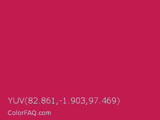 YUV 82.861,-1.903,97.469 Color is a normal rose color and the nearest color is Rose Red #c21e56. Hex code #c21b4f and RGB value is rgb(194,27,79). In RGB color space, this color is composed of 76% red, 11% green, 31% blue, In CMYK color space, this color is composed of 0% cyan, 86% magenta, 59% yellow , 24% black , In HSL color space, this color has a hue angle of 341° , 76% saturation and 43% lightness.