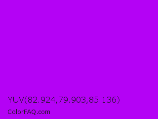 YUV 82.924,79.903,85.136 Color is a normal purple color and the nearest color is Electric Purple #bf00ff. Hex code #b402f5 and RGB value is rgb(180,2,245). In RGB color space, this color is composed of 71% red, 1% green, 96% blue, In CMYK color space, this color is composed of 27% cyan, 99% magenta, 0% yellow , 4% black , In HSL color space, this color has a hue angle of 284° , 98% saturation and 48% lightness.