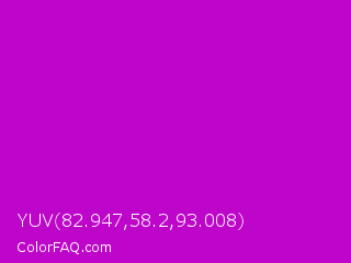 YUV 82.947,58.2,93.008 Color is a normal magenta color and the nearest color is Deep Magenta #cc00cc. Hex code #bd06c9 and RGB value is rgb(189,6,201). In RGB color space, this color is composed of 74% red, 2% green, 79% blue, In CMYK color space, this color is composed of 6% cyan, 97% magenta, 0% yellow , 21% black , In HSL color space, this color has a hue angle of 296° , 94% saturation and 41% lightness.