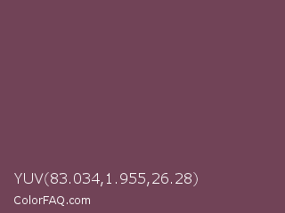 YUV 83.034,1.955,26.28 Color is a normal rose color and the nearest color is Cosmic #76395d. Hex code #714357 and RGB value is rgb(113,67,87). In RGB color space, this color is composed of 44% red, 26% green, 34% blue, In CMYK color space, this color is composed of 0% cyan, 41% magenta, 23% yellow , 56% black , In HSL color space, this color has a hue angle of 334° , 26% saturation and 35% lightness.