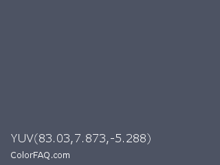 YUV 83.03,7.873,-5.288 Color is a normal blue color and the nearest color is Independence #4c516d. Hex code #4d5363 and RGB value is rgb(77,83,99). In RGB color space, this color is composed of 30% red, 33% green, 39% blue, In CMYK color space, this color is composed of 22% cyan, 16% magenta, 0% yellow , 61% black , In HSL color space, this color has a hue angle of 224° , 13% saturation and 35% lightness.