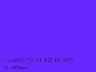 YUV 83.059,84.767,18.365 Color is a normal indigo color and the nearest color is Han Purple #5218fa. Hex code #6827ff and RGB value is rgb(104,39,255). In RGB color space, this color is composed of 41% red, 15% green, 100% blue, In CMYK color space, this color is composed of 59% cyan, 85% magenta, 0% yellow , 0% black , In HSL color space, this color has a hue angle of 258° , 100% saturation and 58% lightness.