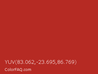 YUV 83.062,-23.695,86.769 Color is a normal red color and the nearest color is Tall Poppy #b32d29. Hex code #b62a23 and RGB value is rgb(182,42,35). In RGB color space, this color is composed of 71% red, 16% green, 14% blue, In CMYK color space, this color is composed of 0% cyan, 77% magenta, 81% yellow , 29% black , In HSL color space, this color has a hue angle of 3° , 68% saturation and 43% lightness.