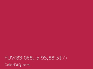 YUV 83.068,-5.95,88.517 Color is a normal red color and the nearest color is Maroon Flush #c32148. Hex code #b82247 and RGB value is rgb(184,34,71). In RGB color space, this color is composed of 72% red, 13% green, 28% blue, In CMYK color space, this color is composed of 0% cyan, 82% magenta, 61% yellow , 28% black , In HSL color space, this color has a hue angle of 345° , 69% saturation and 43% lightness.