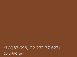 YUV 83.096,-22.232,37.627 Color is a normal orange color and the nearest color is Nutmeg #81422c. Hex code #7e4626 and RGB value is rgb(126,70,38). In RGB color space, this color is composed of 49% red, 27% green, 15% blue, In CMYK color space, this color is composed of 0% cyan, 44% magenta, 70% yellow , 51% black , In HSL color space, this color has a hue angle of 22° , 54% saturation and 32% lightness.