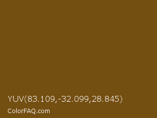 YUV 83.109,-32.099,28.845 Color is a dark orange color and the nearest color is Raw Umber #734a12. Hex code #744f12 and RGB value is rgb(116,79,18). In RGB color space, this color is composed of 45% red, 31% green, 7% blue, In CMYK color space, this color is composed of 0% cyan, 32% magenta, 84% yellow , 55% black , In HSL color space, this color has a hue angle of 37° , 73% saturation and 26% lightness.