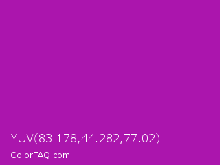YUV 83.178,44.282,77.02 Color is a normal magenta color and the nearest color is Heliotrope Magenta #aa00bb. Hex code #ab15ad and RGB value is rgb(171,21,173). In RGB color space, this color is composed of 67% red, 8% green, 68% blue, In CMYK color space, this color is composed of 1% cyan, 88% magenta, 0% yellow , 32% black , In HSL color space, this color has a hue angle of 299° , 78% saturation and 38% lightness.