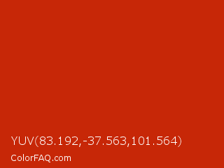 YUV 83.192,-37.563,101.564 Color is a normal red color and the nearest color is Thunderbird #c02b18. Hex code #c72707 and RGB value is rgb(199,39,7). In RGB color space, this color is composed of 78% red, 15% green, 3% blue, In CMYK color space, this color is composed of 0% cyan, 80% magenta, 96% yellow , 22% black , In HSL color space, this color has a hue angle of 10° , 93% saturation and 40% lightness.
