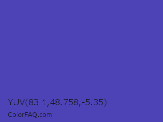 YUV 83.1,48.758,-5.35 Color is a normal indigo color and the nearest color is Ocean Blue #4f42b5. Hex code #4d43b6 and RGB value is rgb(77,67,182). In RGB color space, this color is composed of 30% red, 26% green, 71% blue, In CMYK color space, this color is composed of 58% cyan, 63% magenta, 0% yellow , 29% black , In HSL color space, this color has a hue angle of 245° , 46% saturation and 49% lightness.