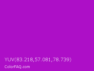 YUV 83.218,57.081,78.739 Color is a normal magenta color and the nearest color is Heliotrope Magenta #aa00bb. Hex code #ad0fc7 and RGB value is rgb(173,15,199). In RGB color space, this color is composed of 68% red, 6% green, 78% blue, In CMYK color space, this color is composed of 13% cyan, 92% magenta, 0% yellow , 22% black , In HSL color space, this color has a hue angle of 292° , 86% saturation and 42% lightness.