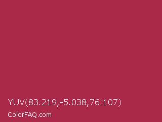 YUV 83.219,-5.038,76.107 Color is a normal red color and the nearest color is Amaranth Purple #ab274f. Hex code #aa2949 and RGB value is rgb(170,41,73). In RGB color space, this color is composed of 67% red, 16% green, 29% blue, In CMYK color space, this color is composed of 0% cyan, 76% magenta, 57% yellow , 33% black , In HSL color space, this color has a hue angle of 345° , 61% saturation and 41% lightness.