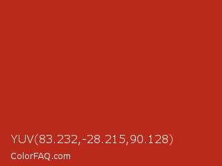 YUV 83.232,-28.215,90.128 Color is a normal red color and the nearest color is Thunderbird #c02b18. Hex code #ba2a1a and RGB value is rgb(186,42,26). In RGB color space, this color is composed of 73% red, 16% green, 10% blue, In CMYK color space, this color is composed of 0% cyan, 77% magenta, 86% yellow , 27% black , In HSL color space, this color has a hue angle of 6° , 75% saturation and 42% lightness.