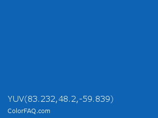 YUV 83.232,48.2,-59.839 Color is a normal blue color and the nearest color is Green Blue #1164b4. Hex code #0f63b5 and RGB value is rgb(15,99,181). In RGB color space, this color is composed of 6% red, 39% green, 71% blue, In CMYK color space, this color is composed of 92% cyan, 45% magenta, 0% yellow , 29% black , In HSL color space, this color has a hue angle of 210° , 85% saturation and 38% lightness.
