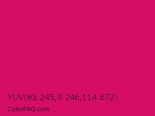 YUV 83.245,9.246,114.672 Color is a normal rose color and the nearest color is Dogwood Rose #d71868. Hex code #d60d66 and RGB value is rgb(214,13,102). In RGB color space, this color is composed of 84% red, 5% green, 40% blue, In CMYK color space, this color is composed of 0% cyan, 94% magenta, 52% yellow , 16% black , In HSL color space, this color has a hue angle of 333° , 89% saturation and 45% lightness.