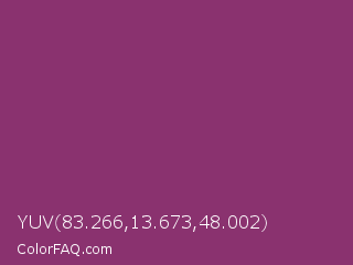 YUV 83.266,13.673,48.002 Color is a normal magenta color and the nearest color is Razzmic Berry Crayola #843179. Hex code #8a326f and RGB value is rgb(138,50,111). In RGB color space, this color is composed of 54% red, 20% green, 44% blue, In CMYK color space, this color is composed of 0% cyan, 64% magenta, 20% yellow , 46% black , In HSL color space, this color has a hue angle of 318° , 47% saturation and 37% lightness.