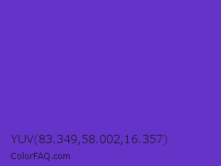 YUV 83.349,58.002,16.357 Color is a normal indigo color and the nearest color is Purple Heart Crayola #652dc1. Hex code #6633c9 and RGB value is rgb(102,51,201). In RGB color space, this color is composed of 40% red, 20% green, 79% blue, In CMYK color space, this color is composed of 49% cyan, 75% magenta, 0% yellow , 21% black , In HSL color space, this color has a hue angle of 260° , 60% saturation and 49% lightness.