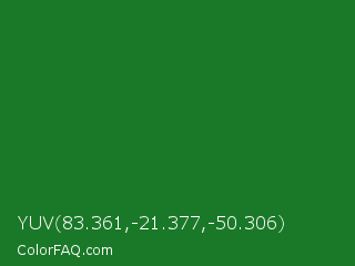 YUV 83.361,-21.377,-50.306 Color is a dark green color and the nearest color is La Salle Green #087830. Hex code #1a7928 and RGB value is rgb(26,121,40). In RGB color space, this color is composed of 10% red, 47% green, 16% blue, In CMYK color space, this color is composed of 79% cyan, 0% magenta, 67% yellow , 53% black , In HSL color space, this color has a hue angle of 129° , 65% saturation and 29% lightness.
