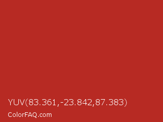 YUV 83.361,-23.842,87.383 Color is a normal red color and the nearest color is Tall Poppy #b32d29. Hex code #b72a23 and RGB value is rgb(183,42,35). In RGB color space, this color is composed of 72% red, 16% green, 14% blue, In CMYK color space, this color is composed of 0% cyan, 77% magenta, 81% yellow , 28% black , In HSL color space, this color has a hue angle of 3° , 68% saturation and 43% lightness.