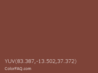 YUV 83.387,-13.502,37.372 Color is a normal red color and the nearest color is Medium Tuscan Red #79443b. Hex code #7e4338 and RGB value is rgb(126,67,56). In RGB color space, this color is composed of 49% red, 26% green, 22% blue, In CMYK color space, this color is composed of 0% cyan, 47% magenta, 56% yellow , 51% black , In HSL color space, this color has a hue angle of 9° , 38% saturation and 36% lightness.