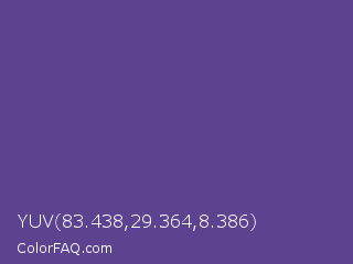 YUV 83.438,29.364,8.386 Color is a normal violet color and the nearest color is Victoria #534491. Hex code #5d438f and RGB value is rgb(93,67,143). In RGB color space, this color is composed of 36% red, 26% green, 56% blue, In CMYK color space, this color is composed of 35% cyan, 53% magenta, 0% yellow , 44% black , In HSL color space, this color has a hue angle of 261° , 36% saturation and 41% lightness.