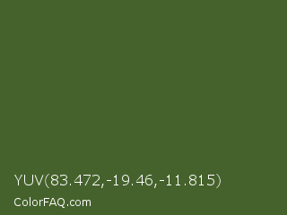 YUV 83.472,-19.46,-11.815 Color is a dark green color and the nearest color is Dark Moss Green #4a5d23. Hex code #46622c and RGB value is rgb(70,98,44). In RGB color space, this color is composed of 27% red, 38% green, 17% blue, In CMYK color space, this color is composed of 29% cyan, 0% magenta, 55% yellow , 62% black , In HSL color space, this color has a hue angle of 91° , 38% saturation and 28% lightness.