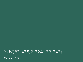 YUV 83.475,2.724,-33.743 Color is a dark cyan color and the nearest color is Spectra #2f5a57. Hex code #2d6659 and RGB value is rgb(45,102,89). In RGB color space, this color is composed of 18% red, 40% green, 35% blue, In CMYK color space, this color is composed of 56% cyan, 0% magenta, 13% yellow , 60% black , In HSL color space, this color has a hue angle of 166° , 39% saturation and 29% lightness.