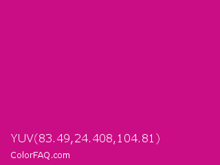 YUV 83.49,24.408,104.81 Color is a normal magenta color and the nearest color is Red Violet #c71585. Hex code #cb0d85 and RGB value is rgb(203,13,133). In RGB color space, this color is composed of 80% red, 5% green, 52% blue, In CMYK color space, this color is composed of 0% cyan, 94% magenta, 34% yellow , 20% black , In HSL color space, this color has a hue angle of 322° , 88% saturation and 42% lightness.