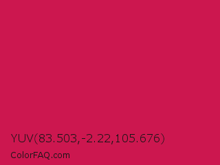 YUV 83.503,-2.22,105.676 Color is a normal rose color and the nearest color is Rose Red #c21e56. Hex code #cc174f and RGB value is rgb(204,23,79). In RGB color space, this color is composed of 80% red, 9% green, 31% blue, In CMYK color space, this color is composed of 0% cyan, 89% magenta, 61% yellow , 20% black , In HSL color space, this color has a hue angle of 341° , 80% saturation and 45% lightness.