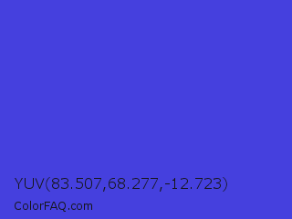 YUV 83.507,68.277,-12.723 Color is a normal indigo color and the nearest color is Iris #5a4fcf. Hex code #4540de and RGB value is rgb(69,64,222). In RGB color space, this color is composed of 27% red, 25% green, 87% blue, In CMYK color space, this color is composed of 69% cyan, 71% magenta, 0% yellow , 13% black , In HSL color space, this color has a hue angle of 242° , 71% saturation and 56% lightness.