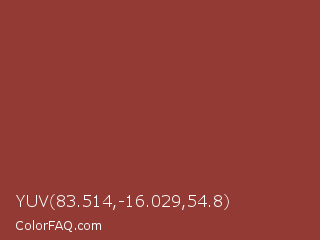 YUV 83.514,-16.029,54.8 Color is a normal red color and the nearest color is El Salva #8f3e33. Hex code #923a33 and RGB value is rgb(146,58,51). In RGB color space, this color is composed of 57% red, 23% green, 20% blue, In CMYK color space, this color is composed of 0% cyan, 60% magenta, 65% yellow , 43% black , In HSL color space, this color has a hue angle of 4° , 48% saturation and 39% lightness.