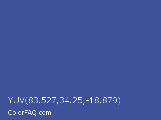 YUV 83.527,34.25,-18.879 Color is a normal blue color and the nearest color is Sapphire #2f519e. Hex code #3e5199 and RGB value is rgb(62,81,153). In RGB color space, this color is composed of 24% red, 32% green, 60% blue, In CMYK color space, this color is composed of 59% cyan, 47% magenta, 0% yellow , 40% black , In HSL color space, this color has a hue angle of 227° , 42% saturation and 42% lightness.