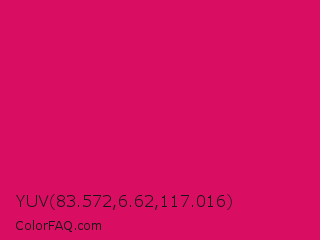 YUV 83.572,6.62,117.016 Color is a normal rose color and the nearest color is Ruby #e0115f. Hex code #d90d61 and RGB value is rgb(217,13,97). In RGB color space, this color is composed of 85% red, 5% green, 38% blue, In CMYK color space, this color is composed of 0% cyan, 94% magenta, 55% yellow , 15% black , In HSL color space, this color has a hue angle of 335° , 89% saturation and 45% lightness.