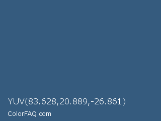 YUV 83.628,20.889,-26.861 Color is a normal blue color and the nearest color is Chambray #354e8c. Hex code #355b7e and RGB value is rgb(53,91,126). In RGB color space, this color is composed of 21% red, 36% green, 49% blue, In CMYK color space, this color is composed of 58% cyan, 28% magenta, 0% yellow , 51% black , In HSL color space, this color has a hue angle of 209° , 41% saturation and 35% lightness.