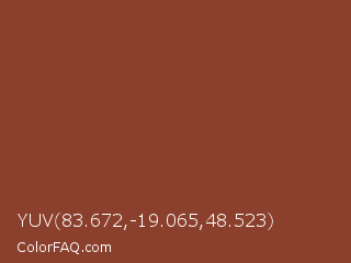 YUV 83.672,-19.065,48.523 Color is a normal red color and the nearest color is El Salva #8f3e33. Hex code #8b3f2d and RGB value is rgb(139,63,45). In RGB color space, this color is composed of 55% red, 25% green, 18% blue, In CMYK color space, this color is composed of 0% cyan, 55% magenta, 68% yellow , 45% black , In HSL color space, this color has a hue angle of 11° , 51% saturation and 36% lightness.