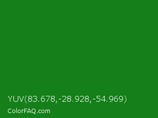 YUV 83.678,-28.928,-54.969 Color is a dark green color and the nearest color is India Green #138808. Hex code #157f19 and RGB value is rgb(21,127,25). In RGB color space, this color is composed of 8% red, 50% green, 10% blue, In CMYK color space, this color is composed of 83% cyan, 0% magenta, 80% yellow , 50% black , In HSL color space, this color has a hue angle of 122° , 72% saturation and 29% lightness.
