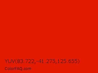 YUV 83.722,-41.275,125.655 Color is a normal red color and the nearest color is Scarlet #ff2400. Hex code #e31b00 and RGB value is rgb(227,27,-0). In RGB color space, this color is composed of 89% red, 11% green, 0% blue, In CMYK color space, this color is composed of 0% cyan, 88% magenta, 100% yellow , 11% black , In HSL color space, this color has a hue angle of 7° , 100% saturation and 45% lightness.