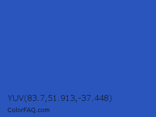 YUV 83.7,51.913,-37.448 Color is a normal blue color and the nearest color is Cerulean Blue #2a52be. Hex code #2955bd and RGB value is rgb(41,85,189). In RGB color space, this color is composed of 16% red, 33% green, 74% blue, In CMYK color space, this color is composed of 78% cyan, 55% magenta, 0% yellow , 26% black , In HSL color space, this color has a hue angle of 222° , 64% saturation and 45% lightness.