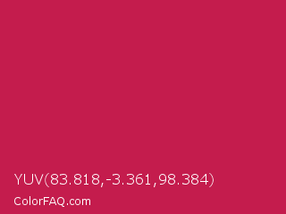 YUV 83.818,-3.361,98.384 Color is a normal rose color and the nearest color is Maroon Flush #c32148. Hex code #c41c4d and RGB value is rgb(196,28,77). In RGB color space, this color is composed of 77% red, 11% green, 30% blue, In CMYK color space, this color is composed of 0% cyan, 86% magenta, 61% yellow , 23% black , In HSL color space, this color has a hue angle of 343° , 75% saturation and 44% lightness.