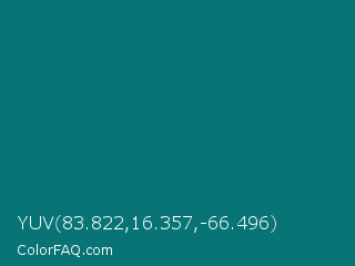 YUV 83.822,16.357,-66.496 Color is a dark cyan color and the nearest color is Atoll #0a6f75. Hex code #087475 and RGB value is rgb(8,116,117). In RGB color space, this color is composed of 3% red, 45% green, 46% blue, In CMYK color space, this color is composed of 93% cyan, 1% magenta, 0% yellow , 54% black , In HSL color space, this color has a hue angle of 181° , 87% saturation and 25% lightness.