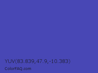 YUV 83.839,47.9,-10.383 Color is a normal indigo color and the nearest color is Ocean Blue #4f42b5. Hex code #4847b5 and RGB value is rgb(72,71,181). In RGB color space, this color is composed of 28% red, 28% green, 71% blue, In CMYK color space, this color is composed of 60% cyan, 61% magenta, 0% yellow , 29% black , In HSL color space, this color has a hue angle of 241° , 44% saturation and 49% lightness.