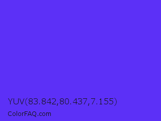 YUV 83.842,80.437,7.155 Color is a normal indigo color and the nearest color is Han Purple #5218fa. Hex code #5c30f7 and RGB value is rgb(92,48,247). In RGB color space, this color is composed of 36% red, 19% green, 97% blue, In CMYK color space, this color is composed of 63% cyan, 81% magenta, 0% yellow , 3% black , In HSL color space, this color has a hue angle of 253° , 93% saturation and 58% lightness.