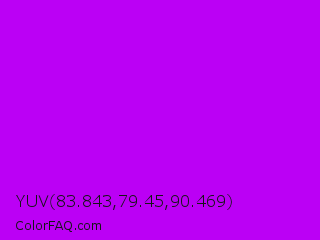 YUV 83.843,79.45,90.469 Color is a normal purple color and the nearest color is Electric Purple #bf00ff. Hex code #bb00f5 and RGB value is rgb(187,-0,245). In RGB color space, this color is composed of 73% red, 0% green, 96% blue, In CMYK color space, this color is composed of 24% cyan, 100% magenta, 0% yellow , 4% black , In HSL color space, this color has a hue angle of 286° , 100% saturation and 48% lightness.